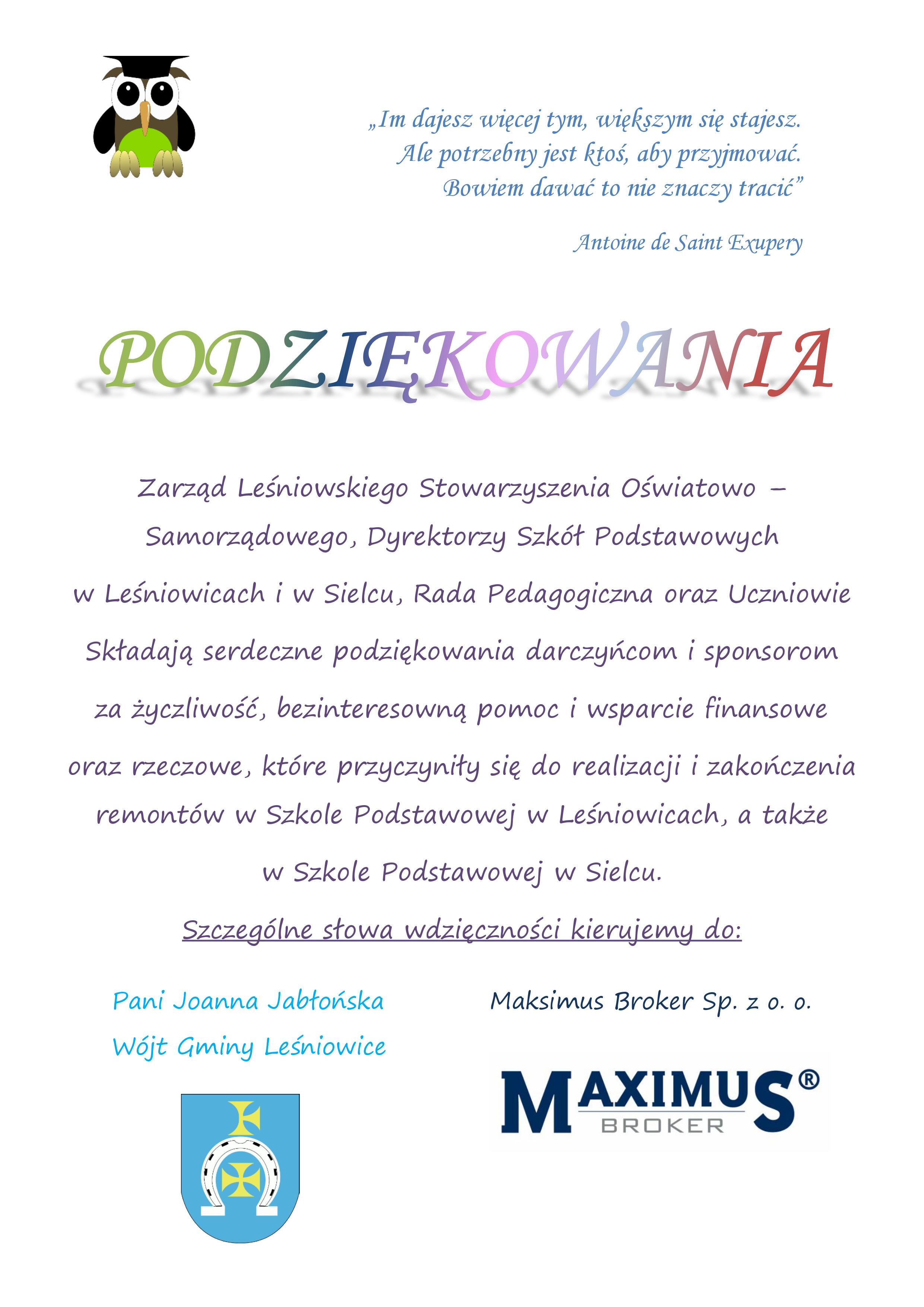 Składamy serdeczne podziękowania dla sponsorów którzy wsparli swoją życzliwością remonty Szkół na terenie Gminy Leśniowice.