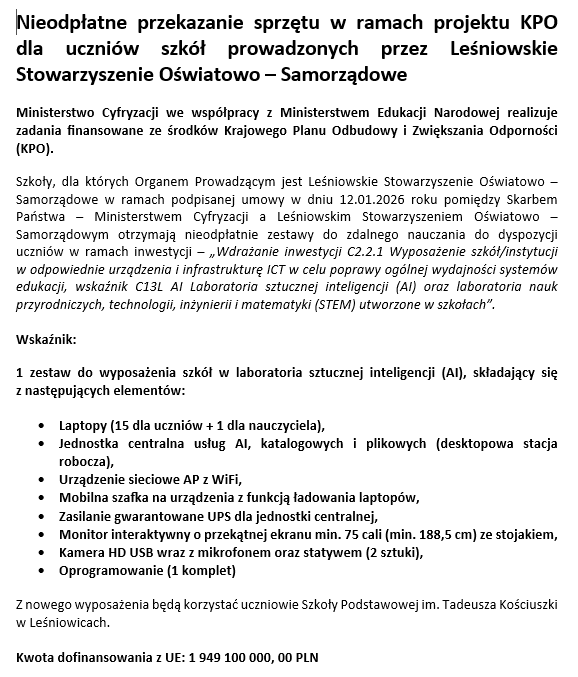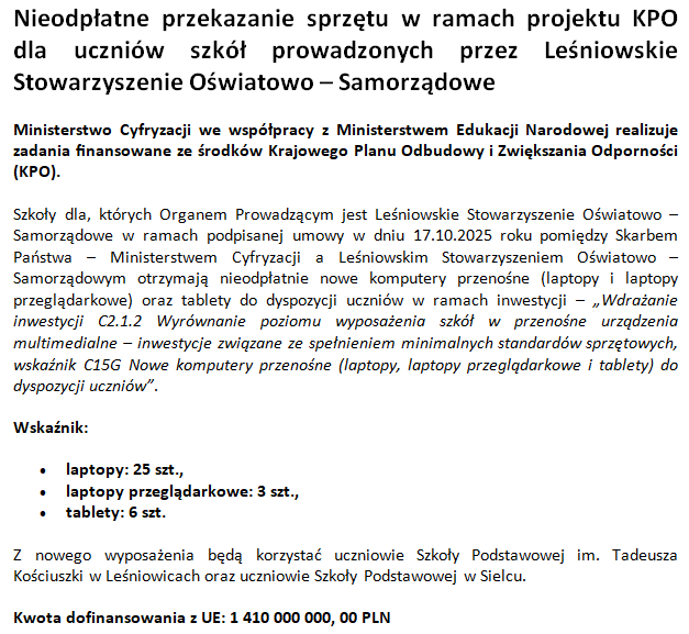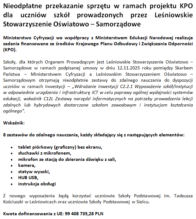 Nieodpłatne przekazanie sprzętu w ramach projektu KPO dla uczniów szkół prowadzonych przez Leśniowskie Stowarzyszenie Oświatowo – Samorządowe
