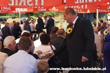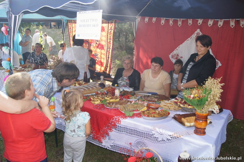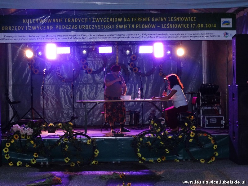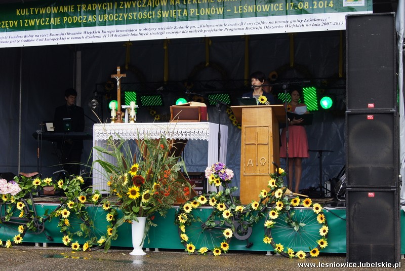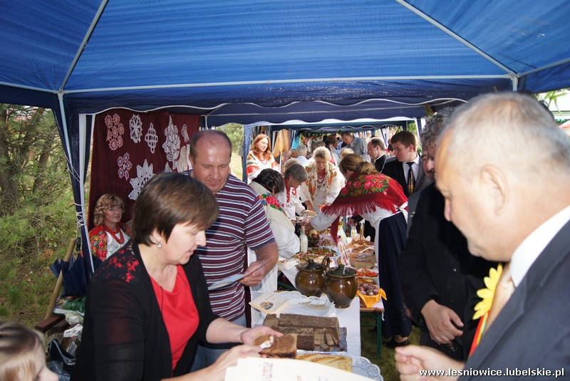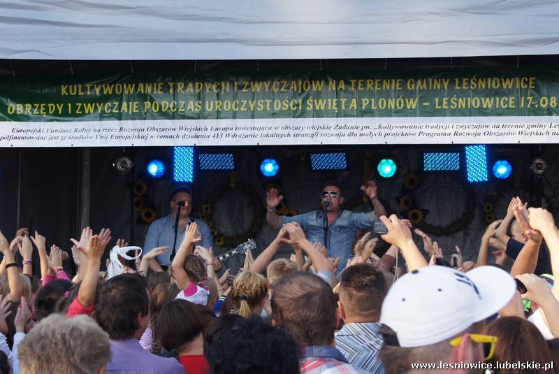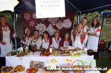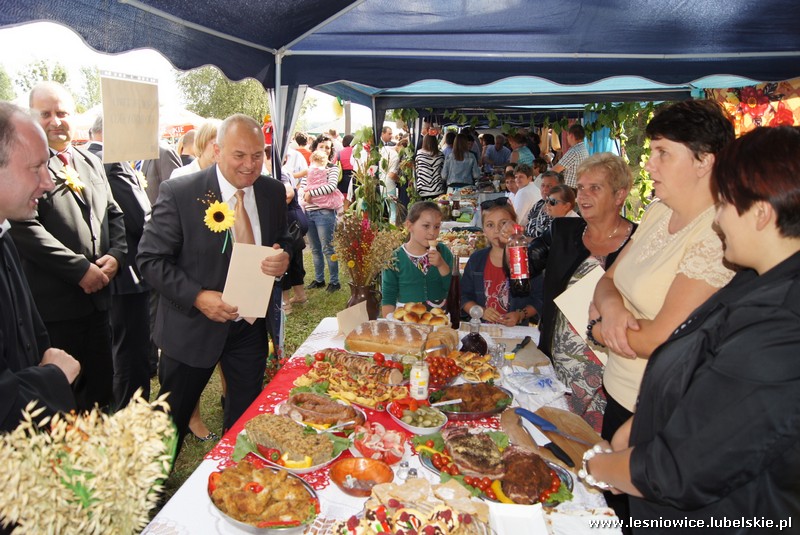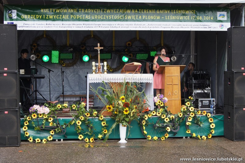 W dniu 17 sierpnia 2014 r. na stadionie sportowym w Leśniowicach odbyła się impreza pn. „Kultywowanie tradycji i zwyczajów na terenie Gminy Leśniowice - Obrzędy i zwyczaje podczas uroczystości Święta Plonów”. Organizatorem imprezy było Leśniowskie Stowarzyszenie Oświatowo – Samorządowe. Zadanie współfinansowane ze środków Unii Europejskiej w ramach działania 413 Wdrażanie lokalnych strategii rozwoju dla małych projektów Programu Rozwoju Obszarów Wiejskich na lata 2007-2013. Dożynki to czas dziękczynienia Stwórcy za zebrane plony. W tym dniu świętuje się zakończenie żniw oraz przypomina o trudnej pracy rolnika, dzięki której codziennie na stoły w naszych domach trafia polski chleb. Jest to jeden z najważniejszych i najpiękniejszych dni w roku każdego rolnika. To radość z uzyskanych plonów i odpoczynek po ciężkiej pracy. Dożynki Gminne tradycyjnie rozpoczęła swoim występem Młodzieżowa Orkiestra Dęta z Leśniowic. Następnie głos zabrała Pani Agnieszka Raczyńska Prezes Leśniowskiego Stowarzyszenia Oświatowo - Samorządowego, która poinformowała wszystkich o pozyskanych środkach na organizację imprezy i podziękowała gospodarzowi dożynek, Panu Wiesławowi Radzięciakowi Wójtowi Gminy Leśniowice, który powitał wszystkich przybyłych gości i wygłosił okolicznościowe przemówienie mówiąc: „W imieniu całej społeczności gminnej dziękuję Wam drodzy rolnicy za całoroczny trud i życzę zawsze udanych plonów, dużo zdrowia oraz wytrwałości i satysfakcji z wykonywanej pracy”. Głos zabrali również zaproszeni goście: w imieniu Wojewody Lubelskiego Pan Michał Jedliński, w imieniu Marszałka Województwa Lubelskiego Pan Kazimierz Stocki, w imieniu Starosty Chełmskiego Pani Renata Wróblewska - Kopczyńska oraz w imieniu Dyrektora Lubelskiego Oddziału Regionalnego Agencji Restrukturyzacji i Modernizacji Rolnictwa Pani Anna Mirzwa. Ponadto w uroczystościach udział wzięli: Pan Franciszek Lubaś Prezes Banku Spółdzielczego w Leśniowicach, Pan Waldemar Szynal Prezes PKS w Chełmie, Pan Mirosław Blacha Łowczy Koła Nr 23 „Szarak” w Chełmie, Pan Sławomir Buczek Komendant Komisariatu Policji w Żmudzi, Pan Arkadiusz Chomecki Kierownik Zespołu Granicznego Placówki w Skryhiczynie, Pan Jacek Semeniuk Wójt Gminy Wojsławice, Pan Piotr Deniszczuk Prezes Zarządu Powiatowego PSL w Chełmie, Pan Czesław Michalczuk Prezes Zarządu Gminnego PSL w Leśniowicach, Pan Kazimierz Zubiński Prezes Przedsiębiorstwa Technobud w Chełmie, Pan Tadeusz Zieńkowski Wiceprezes Firmy Budomel w Chełmie, Pan Jerzy Rudziński Wiceprezes Przedsiębiorstwa Budowlanego Partner w Srebrzyszczu, Pan Eugeniusz Mazurek Prezes Spółki UNIROLP w Srebrzyszczu, Pan Stanisław Drogomirecki Przewodniczący Rady Gminy Leśniowice, radni Rady Gminy Leśniowice, sołtysi, dyrektorzy szkół z terenu gminy, Panie z kół gospodyń wiejskich, twórcy ludowi, zespoły śpiewacze, dzieci i młodzież szkolna oraz bardzo licznie przybyli mieszkańcy naszej gminy i gmin ościennych. Następnie odbyła się uroczysta Msza Święta, którą odprawili: ks. Grzegorz Zając Wikariusz Parafii Kumów Plebański oraz ks. Andrzej Wołoszyn Proboszcz Parafii w Rakołupach. Podczas Mszy Świętej odbył się korowód dożynkowy poprowadzony przez starostów dożynek Państwa Marię i Krzysztofa Kowalczuków z Alojzowa, podczas którego przekazali oni tradycyjny bochen chleba wypieczony z tegorocznej mąki na ręce Wójta Gminy i księży. W korowodzie udział wzięło 14 wieńców dożynkowych przygotowanych przez: Sołectwo Horodysko: mieszkańców wsi Horodysko; Sołectwo Janówka: mieszkańcy wsi Janówka; Sołectwo Kumów Majoracki: Zespół Śpiewaczy „Kumowianki” z Kumowa Majorackiego; Sołectwo Leśniowice: KGW Leśniowice; Sołectwo Majdan Leśniowski: KGW Majdan Leśniowski; Sołectwo Nowy Folwark: mieszkańcy wsi Nowy Folwark; Sołectwo Plisków: mieszkańcy wsi Plisków; Sołectwo Poniatówka: mieszkanki wsi Poniatówka; Sołectwo Rakołupy: Zespół Śpiewaczy „Rakołupianki” z Rakołup; Sołectwo Sarniak: KGW Sarniak; Sołectwo Sielec: Zespół „Sielanki” i Szkołę Podstawową w Sielcu; Sołectwo Teresin: mieszkańcy wsi Teresin; Sołectwo Wierzbica: mieszkańcy wsi Wierzbica. Podczas korowodu można było usłyszeć tradycyjne pieśni dożynkowe czy też wiersze. Po zakończeniu mszy Wójt Gminy i starostowie dożynek podzielili się ze wszystkimi gośćmi poświęconym chlebem. Podczas uroczystości przeprowadzono i rozstrzygnięto konkursy dożynkowe. W konkursie na „Najładniejszy Wieniec Dożynkowy” zwyciężył wieniec uwity przez Panie z KGW w Majdanie Leśniowskim, natomiast w konkursie na „Najsmaczniejszy chleb wiejski” I miejsce zajął chleb upieczony przez Panią Elżbietą Kieliszek z Majdanu Leśniowskiego. Uczestnicy konkursu za wieńce dożynkowe i za przygotowanie stoiska promocyjnego sołectwa otrzymali dyplomy i nagrody finansowe, natomiast za chleb dyplomy i nagrody rzeczowe. Zwycięski wieniec i chleb będą reprezentowały naszą gminę na Dożynkach Powiatowych w Żółtańcach w dniu 14 września br. W trakcie uroczystości odbyły się także zawody strzeleckie, które wygrał Pan Roman Choma, II miejsce otrzymała Pani Karolina Sadowska, a III miejsce wywalczyła Pani Agnieszka Kijańczuk. Sędzią głównym zawodów był Pan Krzysztof Pietrzak. Podczas dożynek można było obejrzeć bogatą część artystyczną, w której zaprezentowały się zespoły śpiewacze z terenu gminy: „Sielanki”, Rakołupianki” i „Kumowianki”, Zespół GOOD BAND z Majdanu Leśniowskiego, Zespół Interia X z Dubienki, solistka Agnieszka Duda z Poniatówki, Kabaret Ubrodowianie z Ubrodowic, a także gwiazda wieczoru Zespół „Power Play”, który zgromadził przed sceną liczną publiczność oraz Zespół Shantell wraz z DJ Petrusem i DJ Kristerem z Klubu „Arka” w Białopolu. Dodatkową atrakcją dla