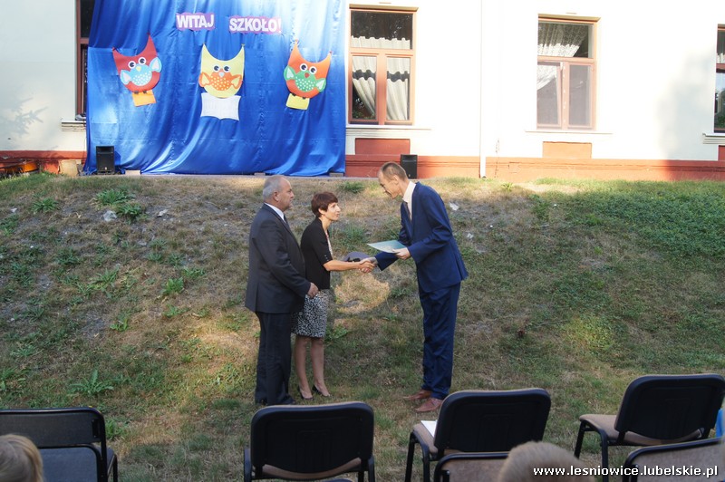 W dniu 1 września 2015 r. w Szkole Podstawowej w Sielcu odbyło się Gminne Rozpoczęcie Roku Szkolnego 2015/2016. W uroczystości udział wzięli: Pan Wiesław Radzięciak Wójt Gminy Leśniowice, Pani Agnieszka Raczyńska Prezes Leśniowskiego Stowarzyszenia Oświatowo-Samorządowego, Pan Dariusz Olszak Dyrektor Publicznego Gimnazjum w Sielcu, Pan Piotr Janiuk p.o. Dyrektora SP w Sielcu, Pan Wojciech Potocki Dyrektor SP w Teresinie, Pani Małgorzata Romańczuk Dyrektor SP w Leśniowicach i Pani Anna Kowal Dyrektor SP w Rakołupach. Otwarcia uroczystości dokonała Pani Ewa Stańkowska, która przedstawiła zaproszonych gości i poprowadziła Gminne Rozpoczęcie Roku Szkolnego. Pani Agnieszka Raczyńska Prezes Leśniowskiego Stowarzyszenia Oświatowo-Samorządowego, powiedziała: „jak już pewnie wiecie rozpoczynający się nowy rok szkolny niesie ze sobą małe zmiany... otóż po złożeniu rezygnacji z funkcji dyrektora szkoły przez Pana Romana Pawelca Zarząd Leśniowskiego Stowarzyszenia Oświatowo - Samorządowego postanowił powierzyć na ten rok szkolny pełnienie obowiązków dyrektora tej szkoły Panu Piotrowi Janiuk.” A następnie wraz z Panem Wiesławem Radzięciak Wójtem Gminy wręczyła Panu Piotrowi Janiuk uchwałę Zarządu Leśniowskiego Stowarzyszenia Oświatowo-Samorządowego powierzającą pełnienie obowiązków Dyrektora Szkoły Podstawowej w Sielcu. Natomiast Pan Wójt mówił: „W trakcie wakacji w Szkole Podstawowej w Leśniowicach i Teresinie wykonano remont podłóg w salach gimnastycznych, które polegały na zerwaniu dotychczasowej nawierzchni i położeniu sportowej. Ponadto przy Szkole Podstawowej w Leśniowicach położono chodnik, który poprawi bezpieczeństwo uczniów w drodze do szkoły.” Ponadto okazji rozpoczęcia roku szkolnego złożył życzenia nauczycielom, uczniom oraz rodzicom. Na zakończenie odbyła się część artystyczna, przygotowana przez uczniów Szkoły Podstawowej w Sielcu pod opieką Pani Beaty Bańka oraz występ Julii Sieńko przy akompaniamencie Pana Kornela Matczuka. Ponadto Rozpoczęcie Roku Szkolnego 2015/2016 odbyło się we wszystkich placówkach oświatowych tj.: Szkole Podstawowej w Teresinie, Rakołupach, Leśniowicach oraz w Publicznym Gimnazjum w Sielcu. Rok szkolny 2015/2016 w Gminie Leśniowice został otwarty!